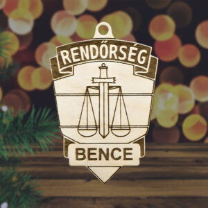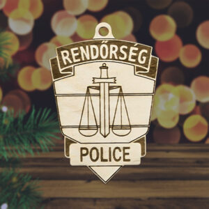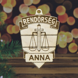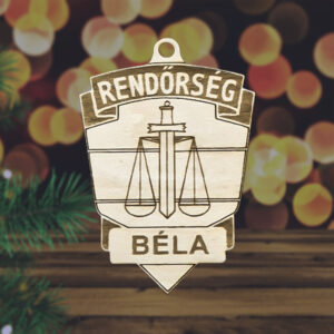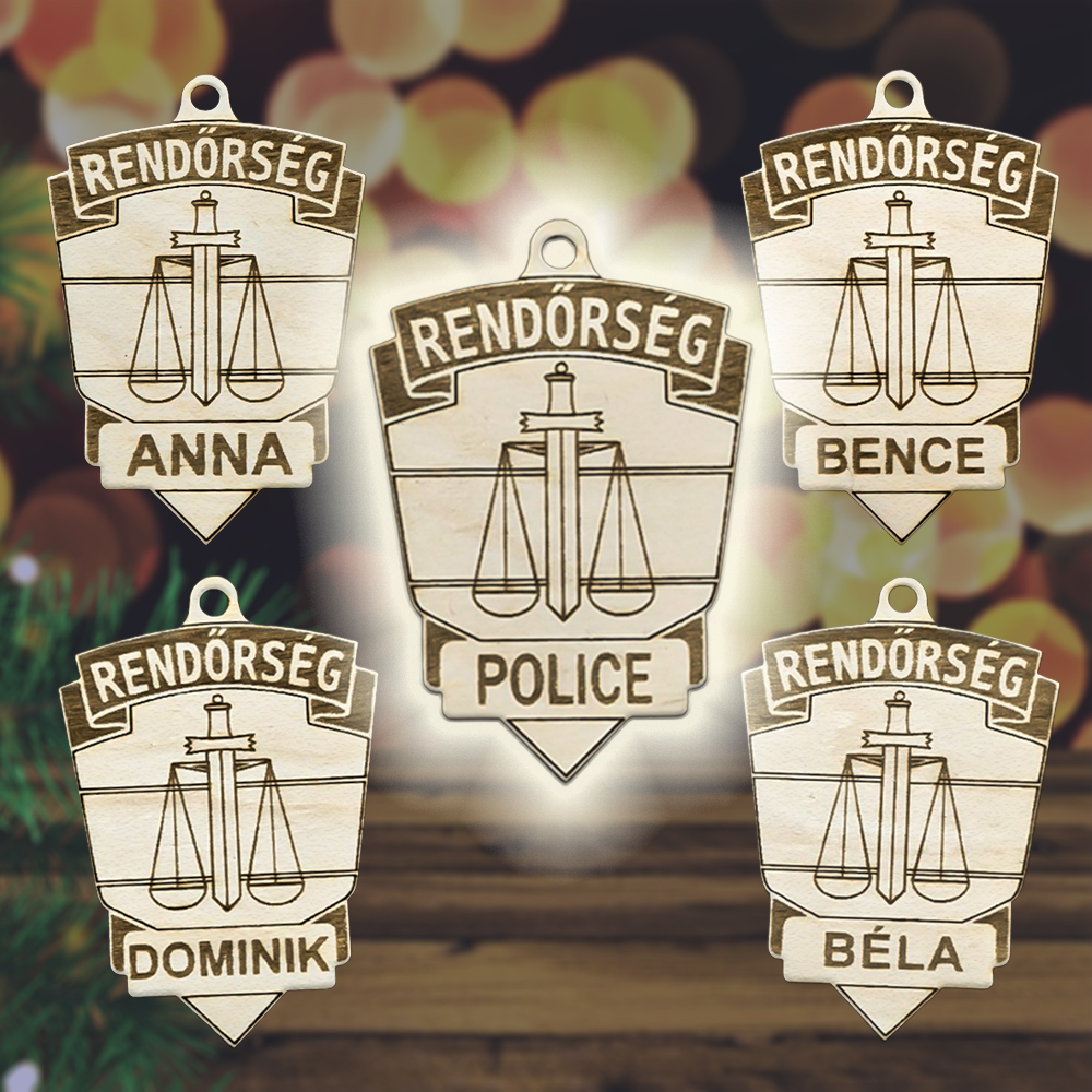 Fából készült rendőrségi jelvény karácsonyfadísz egyedi névvel